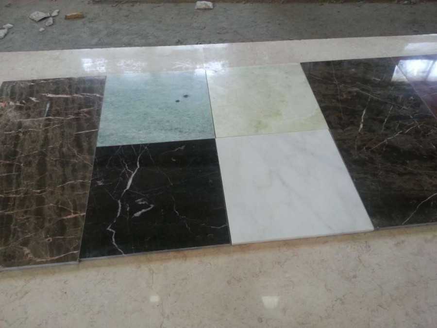 Название говорит само за себя. Наиболее бюджетный вариант с преимуществами керамической плитки и эстетическими характеристиками близкими к мрамору. Изготавливается прессованием, измельченных до нужной фракции (пыль, отсев, щебень), отходов мрамора. В качестве связующего используют экологически чистые материалы (акриловые или водные дисперсии).