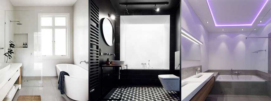 Шикарным видом обладает душевая лейка с подсветкой, создающая цветной поток воды. Не менее необычным решением считается потолок в виде звездного неба или светящихся капель со светодиодными точечными элементами. Для создания оригинального освещения при помощи подсветки декорируют бортики ванной и подиумы, а точечными светильниками оформляют ниши, экраны или плинтуса.