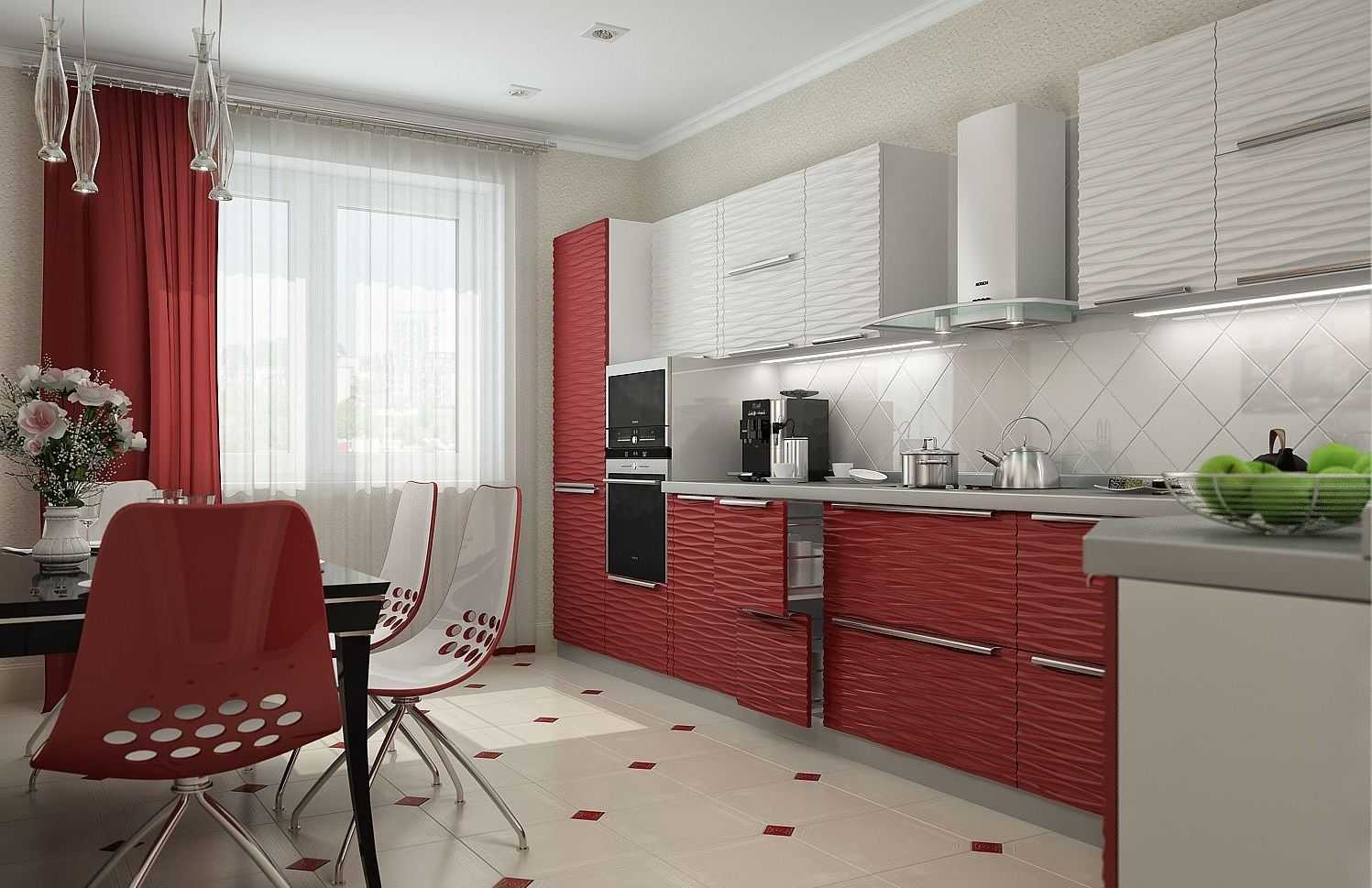 Белый и черный цвета могут выглядеть презентабельно, однако некоторые полагают, что они достаточно скучны. Альтернативным вариантом является замена черного на ярко-красный. Если поиграть с оттенками сочетания, можно выделить наиболее удачные для конкретного случая варианты, например, элементы красно-черной кухни. Некоторые предпочитают классический красный, а кто-то выберет его приглушенный оттенок. Если целью обновления интерьера является придание хорошего настроения на целый день, следует выбрать алый цвет, который будет доминировать. Белый призван оттенять и разбавлять его. Чтобы разнообразить интерьер, можно добавить яркие аксессуары, такие как зеленые яблоки на столе.