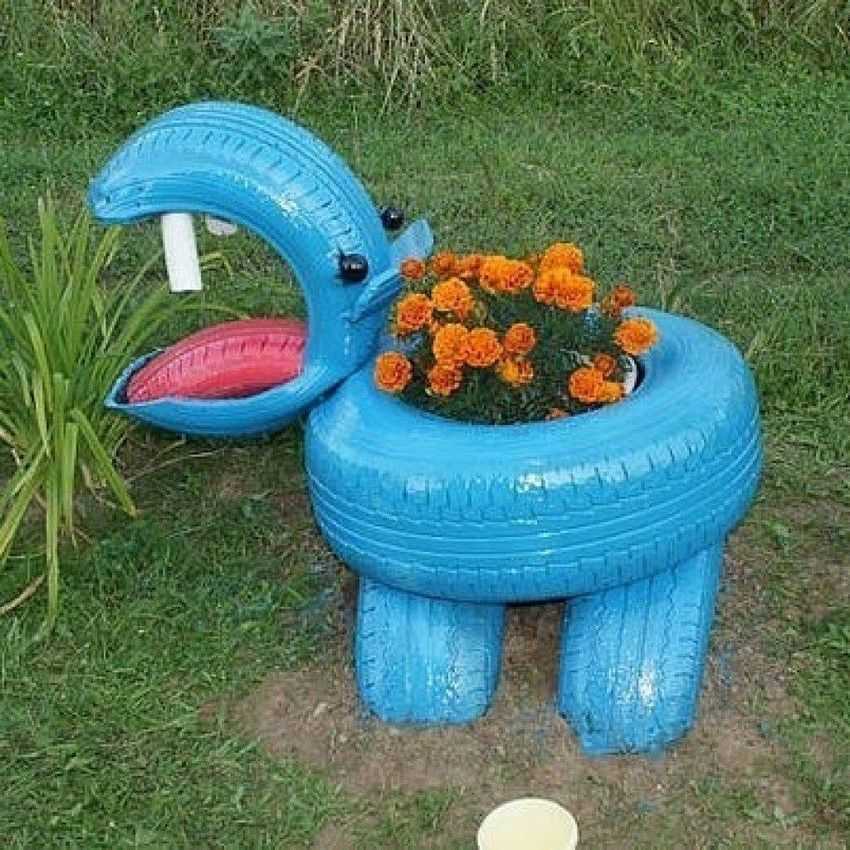 Кстати, этот веселый и яркий попугай сделан из старой шины, кто бы мог подумать, что из ненужных материалов можно изготовить такую красоту! А вот и слоник…