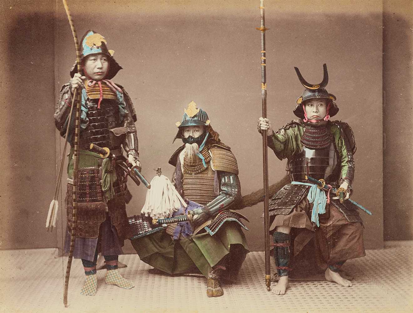 Три самурая с разным оружием (слева направо): юми, катаной и яри. Фотография Кусакабэ Кимбэя. 1860-е годыJ. Paul Getty Museum