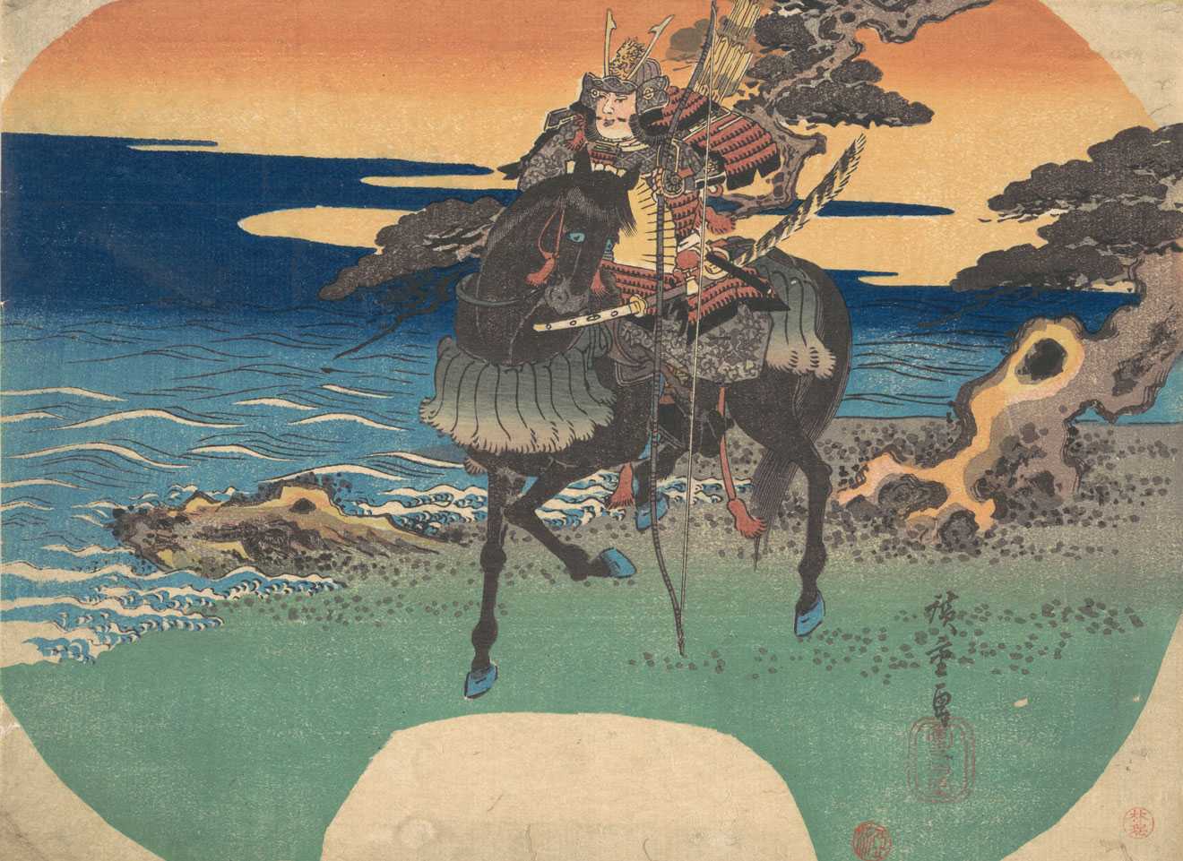 Воин едет верхом на вороной лошади вдоль морского берега. Гравюра Утагавы Хиросигэ. Около 1835 годаThe Metropolitan Museum of Art