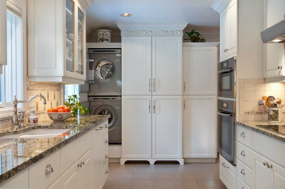 Вертикальное размещение стиральных машин в углу кухни классического стиля