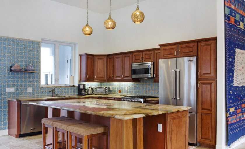 Кухня. Идеальное место для воссоздания оригинального дизайна. Стильная обстановка достигается использованием износостойких высокотехнологичных материалов; предпочтение отдается пластику, алюминию, стеклу, нержавеющей стали. Эталон стиля — комната со специальной модульной мебелью и со всей требуемой техникой; удачный ход — использование акцентной светодиодной подсветки.