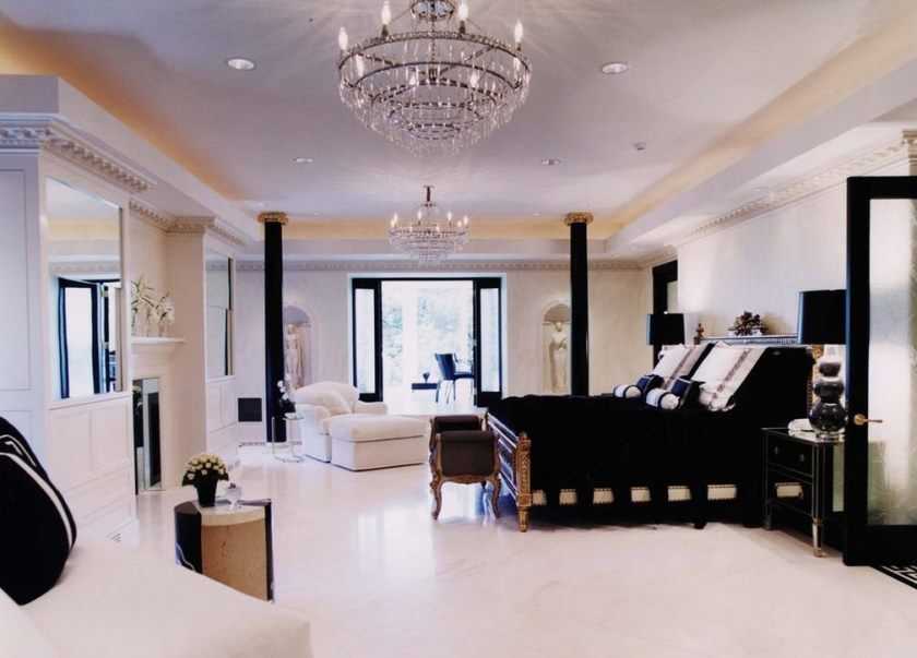 Декор – из мрамора, известняка или резного дерева, а вокруг – большие зеркала в массивных золоченых рамах. Можете украсить комнату скульптурами. Для оформления окон используются объемные тяжелые портьеры с ламбрекенами, бахромой и кистями.