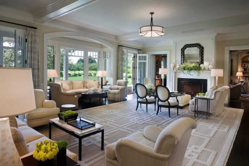 По периметру располагают полосы строгих геометрических рисунков. Большая площадь помещения, предназначенная для приема гостей, получит аристократическое звучание благодаря использованию ключевого орнамента греческих дизайнеров древности: правильные квадраты, разбитые с помощью плитки разных размеров.