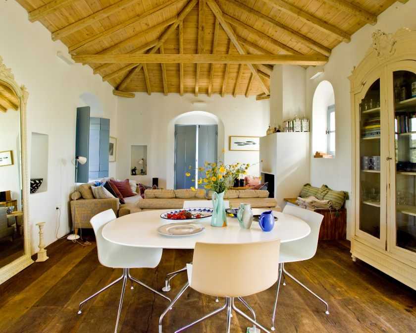Если романский стиль в интерьере характерен тяжелыми и величественными формами, то в греческом нечасто встретишь даже элементарные карнизы. Любым шторам греки предпочитают деревянные ставни, которые красят в бирюзовый или лазурный цвет — существует поверье, что это отпугивает злых духов. Вряд ли это можно повторить в городских реалиях, но для дома за городом идея красивая.
