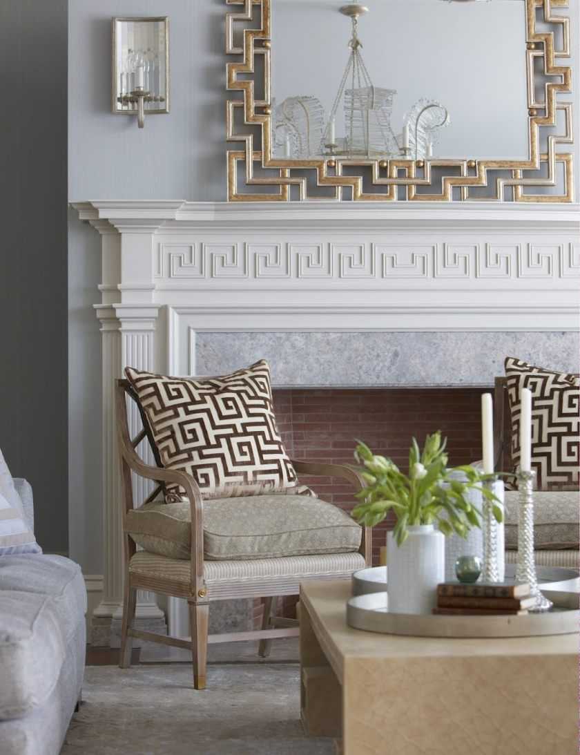 В современной гостиной, оформленной в греческом стиле, классический мраморный пол дополнен ковром с меандровым узором
