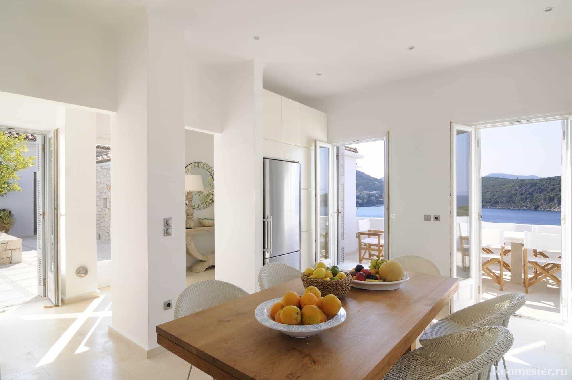 Преимущество белого цвета, который дополняют естественные природные тона. Белый присутствует в оформлении пола, потолка, стен и даже мебели, а другие цвета представлены в предметах декора и текстиле.