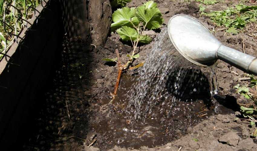 - В подготовленное углубление посадите черенок, удерживая его вручную, после слегка засыпьте его грунтом. Затем обильно полейте лунку водой.