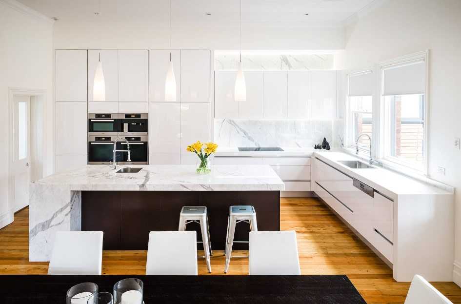Все участки могут идти последовательно, но размещение рабочей зоны в центре – стильный, наиболее удобный вариант. Рабочая поверхность для кухни должна располагаться так, чтобы было удобно перемещаться во время готовки. На фото изображен удачный вариант планировки.